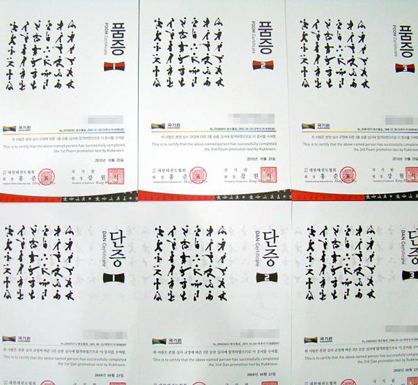 지난 9월부터 바뀐 품·단증이 발급된다고 들었는데 이제서야 실제로 보게 되었다. 전체적으로 매우 깔끔하고 세련되게 바뀌었는데 왼쪽 상단의 캘리그래피는 태권도의 품새를 표현한 것이라 하는데 정확히 무엇(어떤 동작)을 의미하는 것인지는 모르겠다. 품·단증이 새롭게 바뀌었으면 그에 따른 보다 자세한 설명이 있었으면 하는데 아쉬운 부분이다.