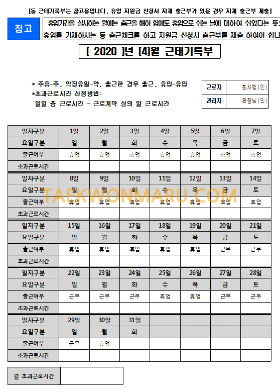 - 근태기록부로 대체해도 된다. (아래에 첨부)