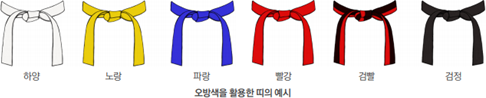 국기원에서는 위와 같이 우리가 익히 알고 있는 오방색으로 설명하고 있다. 태권도가 유소년들을 중심으로 퍼지기 시작하면서부터 사용되던 것이기에 이것을 토대로 현시대의 흐름에 맞게 좀 더 다양한 띠가 도입되었으면 하는데 국기원은 일선 도장과는 생각이 다른가 보다.
