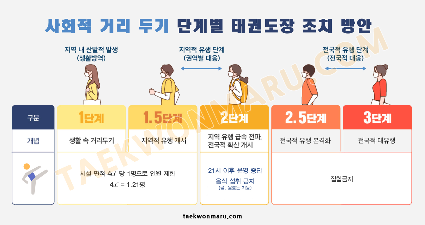 태권도장은 '일반관리시설' 중 '실내체육시설'의 기준에 맞춰 실행해야 하는데, 같은 일반관리시설이라도 업종별로 약간씩 차이가 있어 태권도장(실내체육시설)을 기준으로 조치 방안을 정리하였습니다.