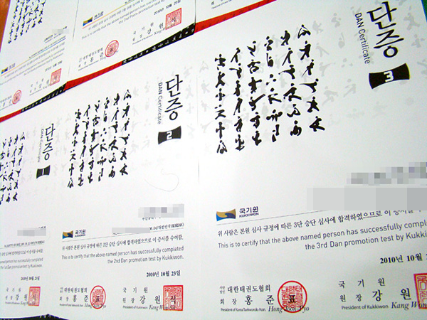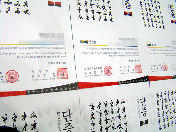 지난 9월부터 바뀐 품·단증이 발급된다고 들었는데 이제서야 실제로 보게 되었다. 전체적으로 매우 깔끔하고 세련되게 바뀌었는데 왼쪽 상단의 캘리그래피는 태권도의 품새를 표현한 것이라 하는데 정확히 무엇(어떤 동작)을 의미하는 것인지는 모르겠다. 품·단증이 새롭게 바뀌었으면 그에 따른 보다 자세한 설명이 있었으면 하는데 아쉬운 부분이다.