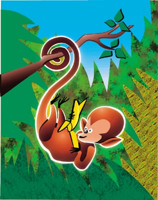 3. 숨어서 원숭이가 나타나기를 기다린다. 얼마 후, 원숭이가 나타나 자루 속을 들여다 보고, ‘이게 웬 떡이냐?’며 좋아라고 주머니 속에 손을 넣어 과일을 잡는다.