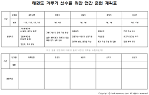 상단에 있는 표는 부산체육고등학교 태권도부의 연간 훈련 계획이다. 종일 태권도를 수련하는 선수들의 훈련 일정이고, 우리는 단기간에 수련생들의 기량을 끌어 올려야 하기 때문에 위의 방식을 참고하여 새로 작성할 필요가 있다.
