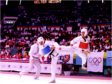 4. 양손은 주먹을 가볍게 쥔 다음 팔굽을 구부려 가슴 앞에 위치하고, 어깨는 힘을 주지 않고 부드러운 상태로 겨루기 자세를 취한다.