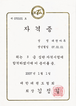 문화체육관광부에서 발급하는 자격증으로 도장을 개관할 때 태권도 사범지도자 자격증과 함께 반드시 있어야 하는 자격증이다.