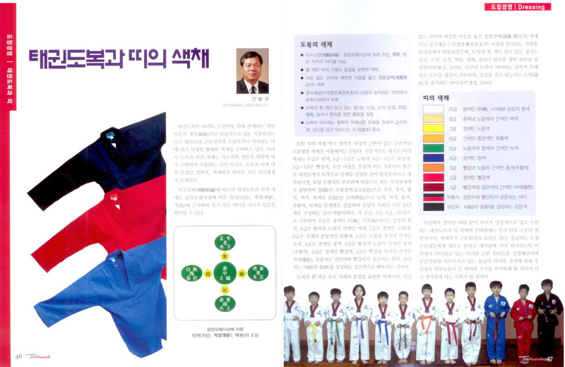 예로부터 우리의 선조들은 복식의 형태에서 색채와 더불어 대(帶)나 혁대(革帶)의 장식물로서 그 신분의 위치를 표시했던 시기가 있었으나, 태권도장에서는 심신을 수련할 목적으로 신체의 접촉이 불가피하기 때문에 장식물에 의한 상하의 구별은 불가하므로 태권도에서는 동양철학적 기저 속에서 오행의 의미를 나타내는 색채의 차이로 그 상하를 구분하고 있다.