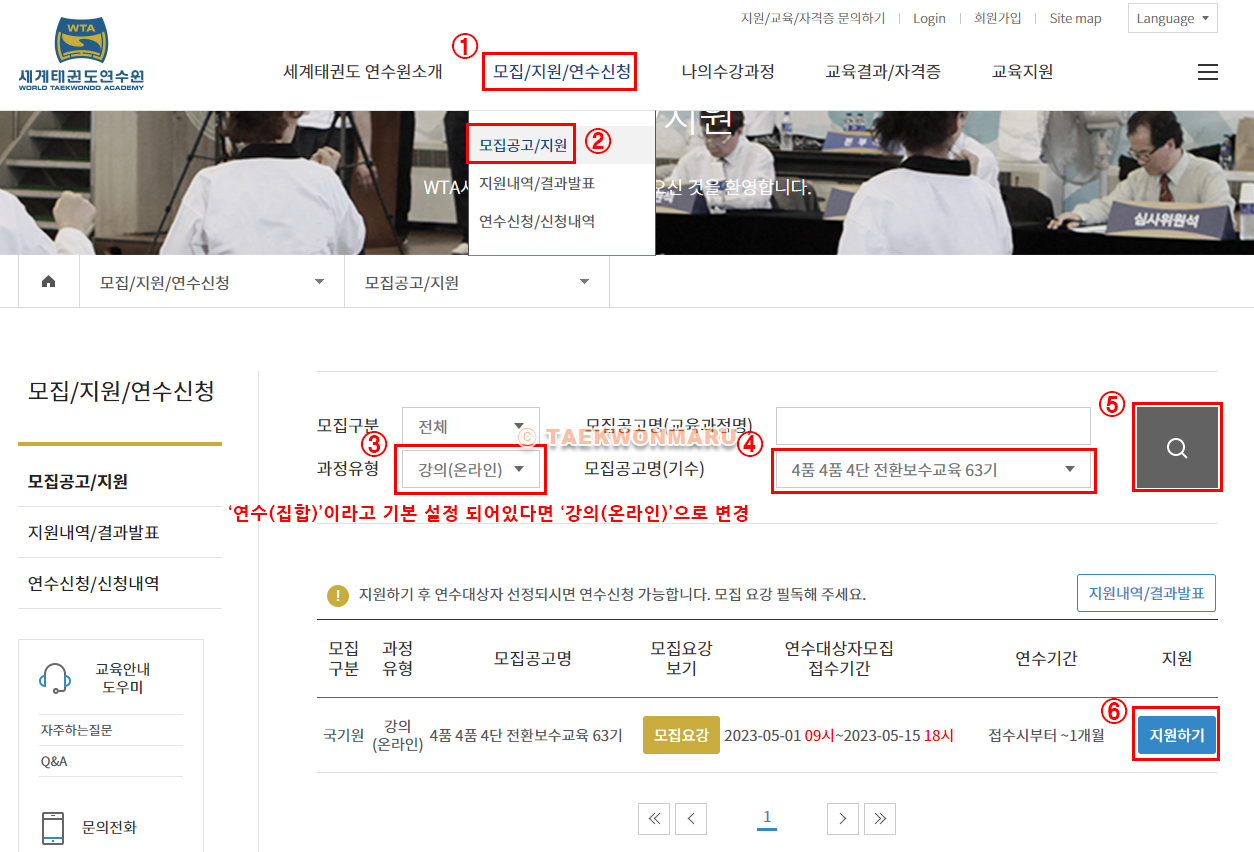 2. 수련 기간을 채우고 아이디를 받았으면 세계태권도 연수원에 회원가입 / 로그인 한다. http://wta.kukkiwon.or.kr