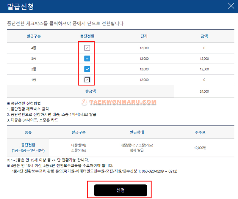 1품~3품까지는 아래와 같이 티콘(https://www.tkdcon.net) 홈페이지에서 간편하게 바로 전환할 수 있다. 티콘은 국기원 홈페이지에서 심사업무 및 발급업무 부분을 따로 떼어낸 플랫폼이다.