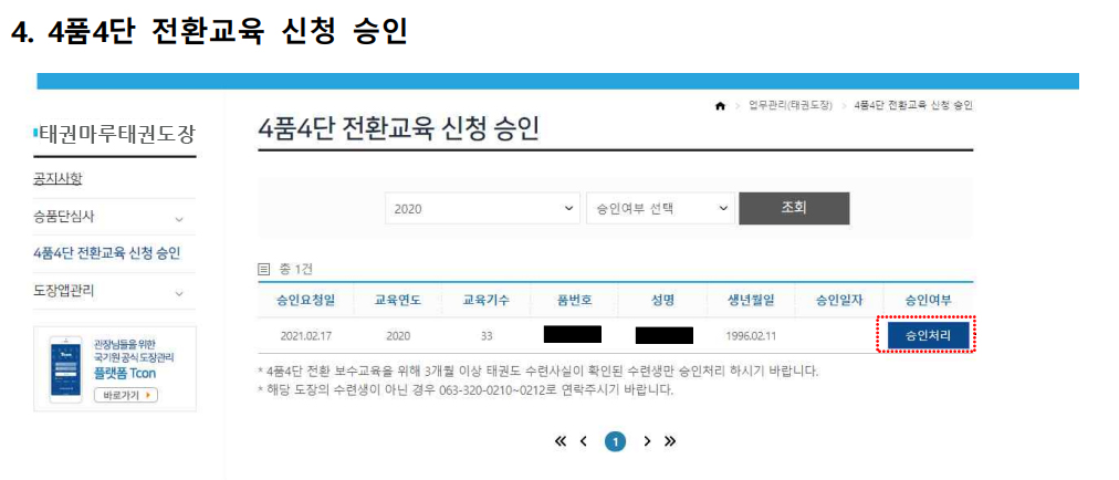 4. 태권도장 관장님이 티콘에 접속하여 [업무관리] - [4품4단 전환교육 신청 승인]에서 승인을 한다.