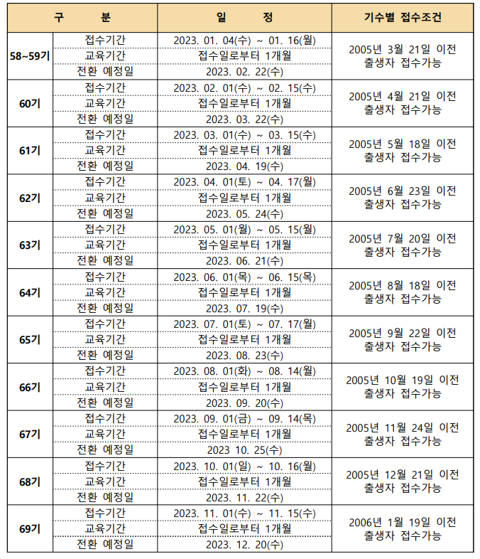 - 태권도 4품자로서 만 18세 이상자 (전환일 기준 만 18세 1개월 미도래 기간까지 접수 허용)