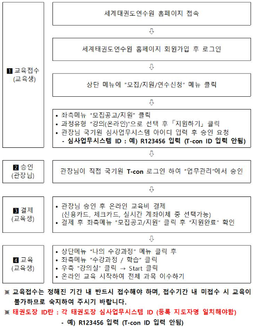 - 기존에 계속 도장을 다녔다면 문제 없이 아이디를 받을 수 있겠지만, 태권도장을 다니지 않고 있다면 최소 3개월 이상 수련하러 다시 등록해야 한다.