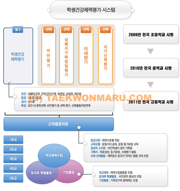 자료를 살펴보니 2005년 학교체육 활성화와 학생 체력증진을 위한 대책 마련으로 「학교체육 혁신방안」이 수립되었고, 관계기관들이 협력하여 2006년 맞춤형 학생 건강 체력 평가시스템이 구축되었다. 2007년에 시범학교가 운영되었으며 2008년부터 단계적으로 전면 시행할 예정이었으나 뭐가 잘못되었는지 미뤄진 것 같다.