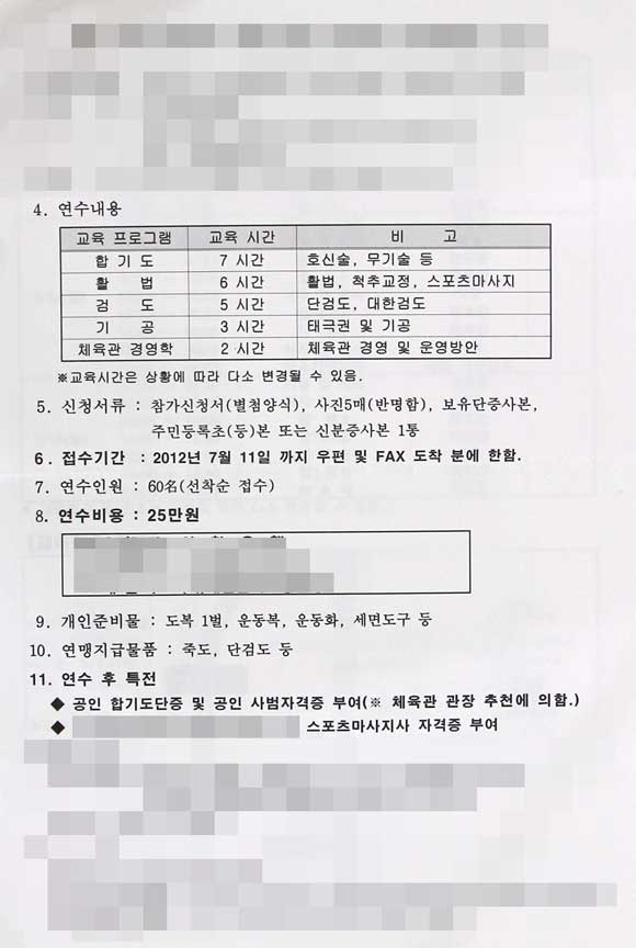쉽게 말하면 25만 원 내고 3일간 연수를 받으면 합기도 단증과 사범 자격증을 발급해 준다는 것이다. 스포츠마사지 자격증까지…. 확인해 보지는 않았지만, 사범 자격증을 준다는 것을 보면 적어도 합기도 4단 단증이 포함되어 있을 것이다.